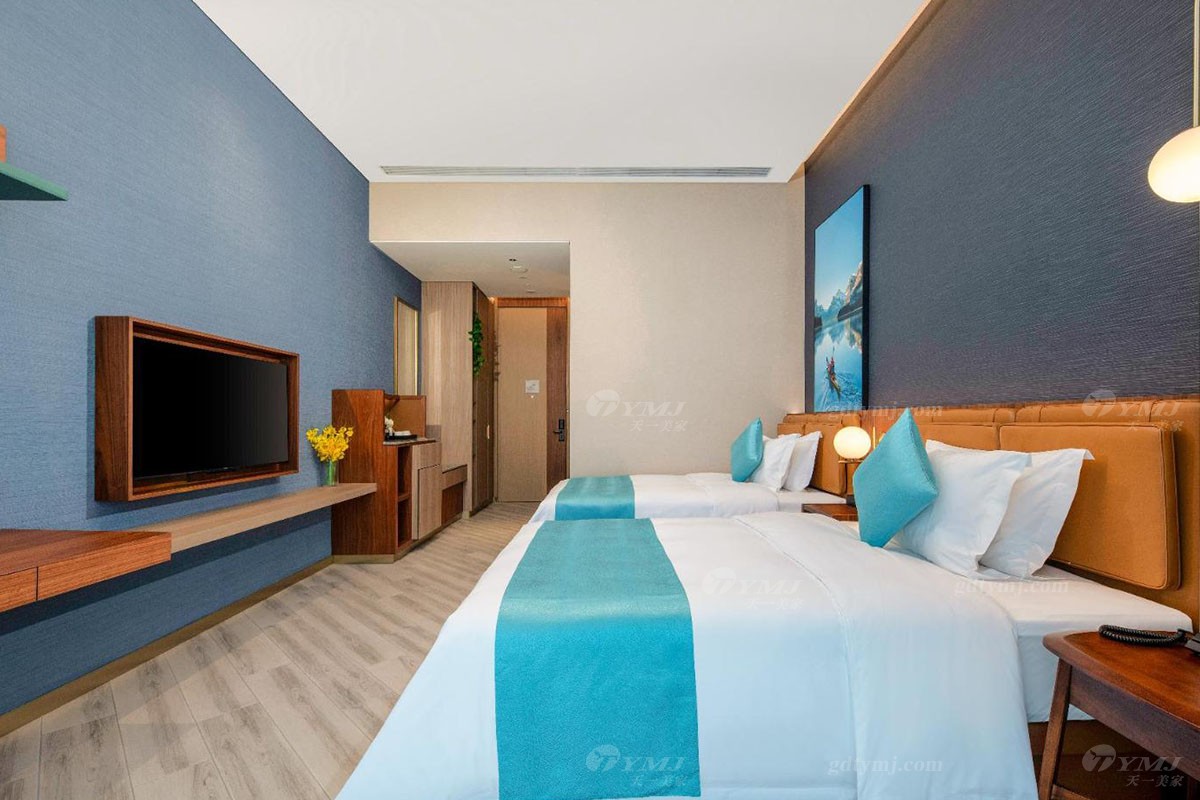 雅致双床房首先映入眼帘的是一整面灰蓝色纯色装饰的背景墙,色调略显深邃而宁静;两张橘黄色皮艺大床铺上蓝、白色系的床品,显得既优雅舒适又充满清爽活力,与背景墙灰蓝色的基调相映成趣,使得整个空间地多增添了几分温馨、和谐。