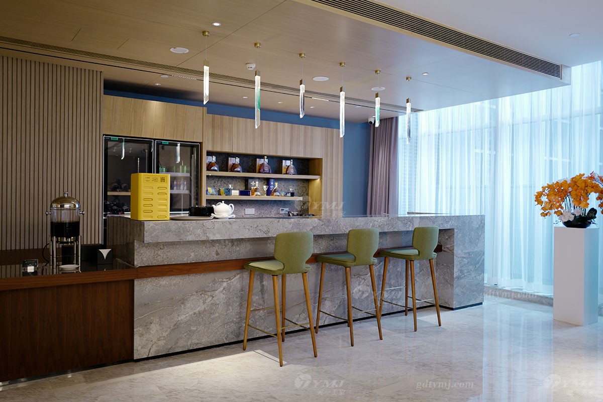 穿过电梯过道,即是酒店前台服务大堂,空间敞亮,原木色木条装饰而成的吊顶,造型独特的不锈钢金属球形灯,别具一格。隔壁的吧台由实木结合大理石打造而成,旁边一张两米多实木长功能桌,纹理深邃细腻,凸显高质感和档次,可以点一杯咖啡,坐在吧椅上跟朋友一起细细品味、随意聊天,很是惬意。