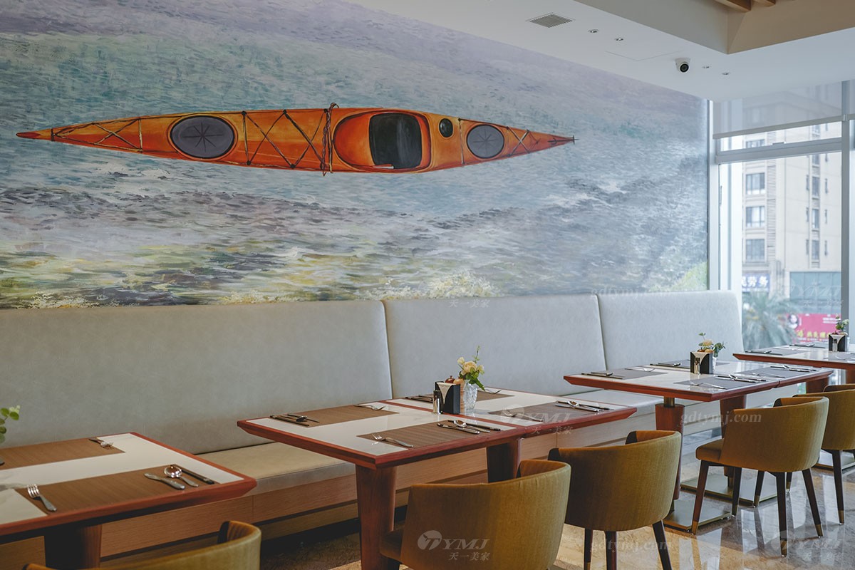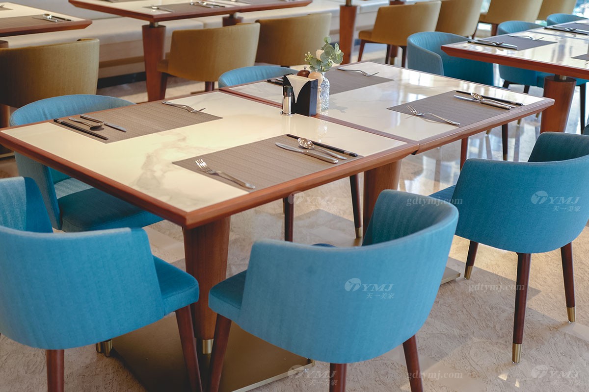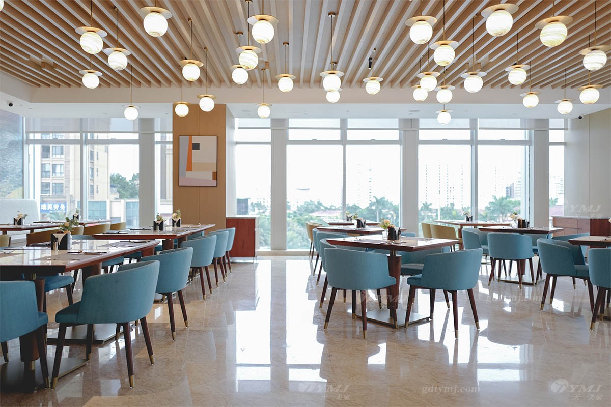 清新雅致的酒店自助餐厅,空间宽敞明亮,实木方形的小餐桌,表面纹理质朴、触感温润,金属底座的巧妙融入,带来很强的时尚现代感同时多了一份优雅,精心制造的北欧风实木餐椅,蓝色和嫩绿色的布艺椅面相得益彰,整个餐厅呈现出清新自然、北欧风情满满的氛围,瞬间打开你的味蕾,沉浸于这份难得的宁静与美食的享受当中。