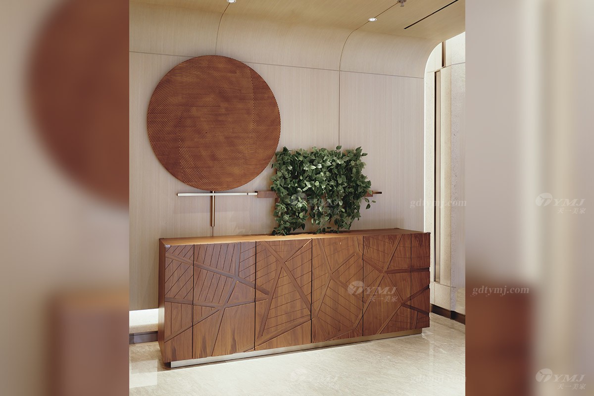 酒店入口处一张简约时尚的实木功能服务台,绿色吧椅,原木实木长条凳,简洁实用,为到访的宾客提供全方位的指引服务,原木实木装饰柜,表面做不规则实木条装饰设计,墙面镶挂一块实木条纹大圆盘,整体呈现出东方文化韵味的“方圆”格局,旁边搭配的一抹绿植,营造出原汁原味的自然视觉感。
