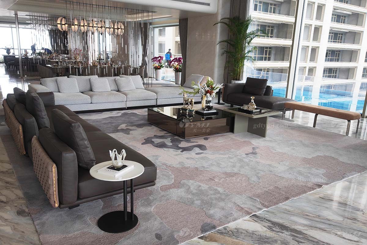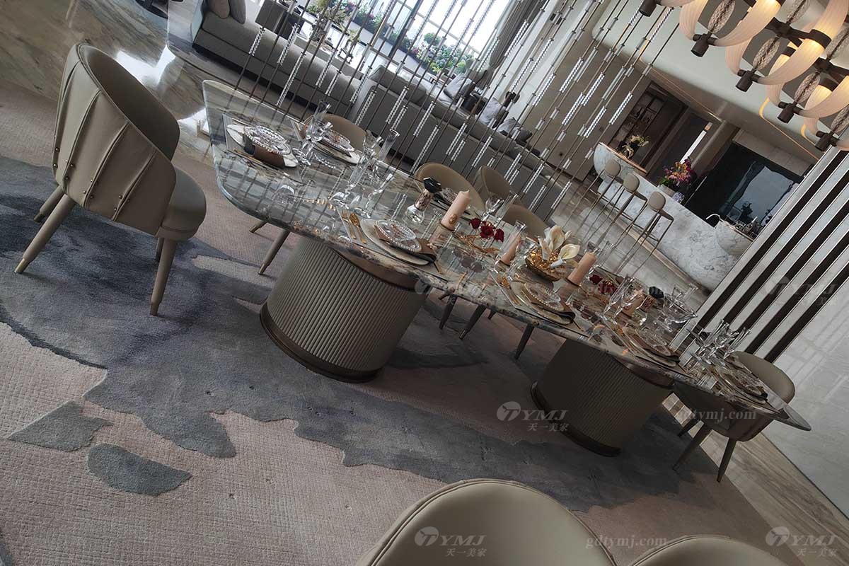 由客厅透过一道时尚的金属装饰隔断,便是餐厅区,餐厅区共分两部分,分别为可容纳10人座的西式大理石长餐桌,底座由两个大圆柱体支撑着整个天然大理石台面,奢华又大气,让你感受到来自西餐的浪漫。与之对应的便是一张可容纳12人的大圆形餐台,时尚灰色皮艺餐椅,与圆餐台大理石色调搭配完美融合、和谐统一,彰显高雅、奢华感十足。