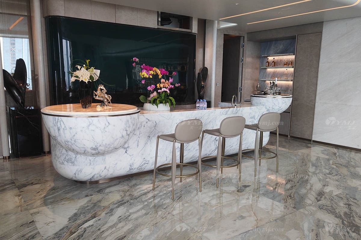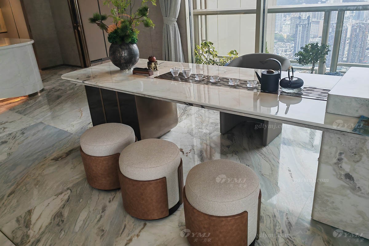 开放式的茶室区,视野非常开阔,空间通透,同样采光充足,中间一张长达2米多的大理石长茶台,由精选天然白色大理石结合实木精心打造而成,镶嵌金属条配饰,细节感满满。闲余时分,约上三五知己抑或独自一人,可一边慢慢品茶一边欣赏外面无尽美景,甚是惬意。