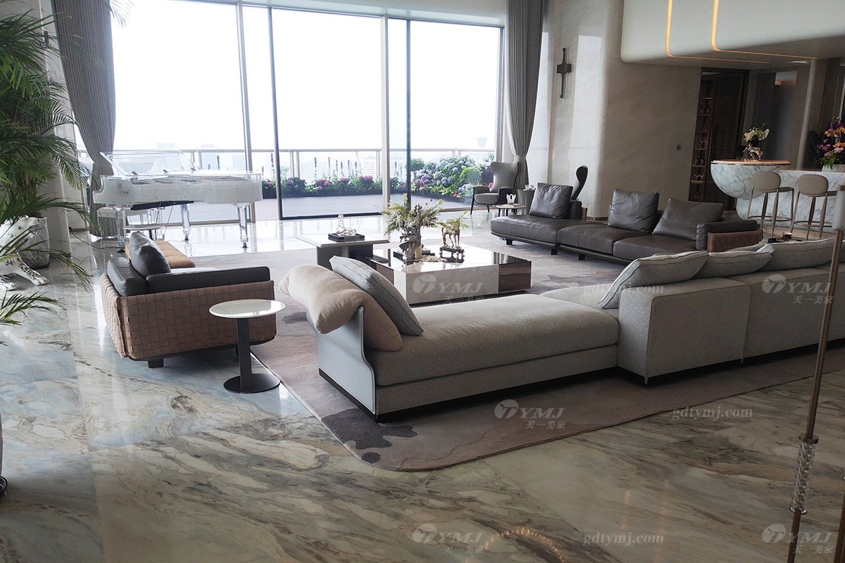 超大的客厅居住空间,达7.2米的超高层高,绝对的宽敞明亮,采光充足,U型皮布艺结合沙发组合,简约大气、舒适自然,穿过钢化玻璃门直通超大阳台,阳台上种满了花草,枝繁叶茂,花团锦簇,香味怡人;客厅一角矗立着一架纯白色水晶三角钢琴,犹如一件优雅的艺术珍品,闲暇时,弹上一曲,美妙的音符仿佛也在诉说着喜悦,客厅旁边即是由白色大理石打造的大吧台,吧台两端凸出的半球造型,显得分外雅致有趣,整个偌大的空间,不论是会客还是家庭聚会,都可满足你所有的想象。