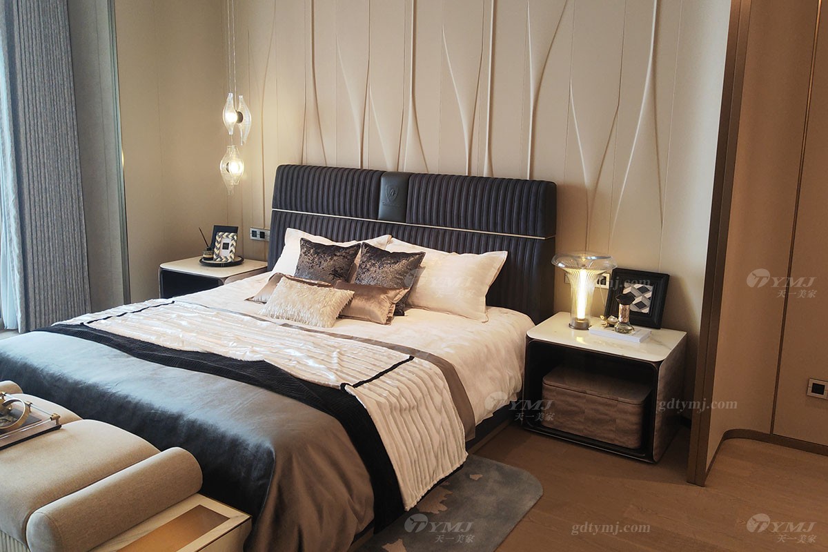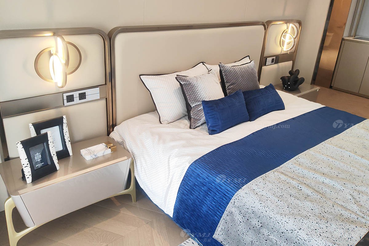卧室自带大阳台,由超大落地玻璃窗隔绝了来自外界的喧嚣与侵扰,还室内一片安宁,但是并不妨碍温暖的阳光肆意洒进来,带给人通透明亮的心境享受;宽大的床屏由金属框架结合实木及布艺工艺精制而成,色调与墙壁背景色融为一体,低调而不失高雅,创意悬挂式的床头灯,形状独特,暖色调光源,增添了温馨氛围,整个卧室空间从设计到家具、软装搭配布局集奢华、实用性、温馨舒适于一体。